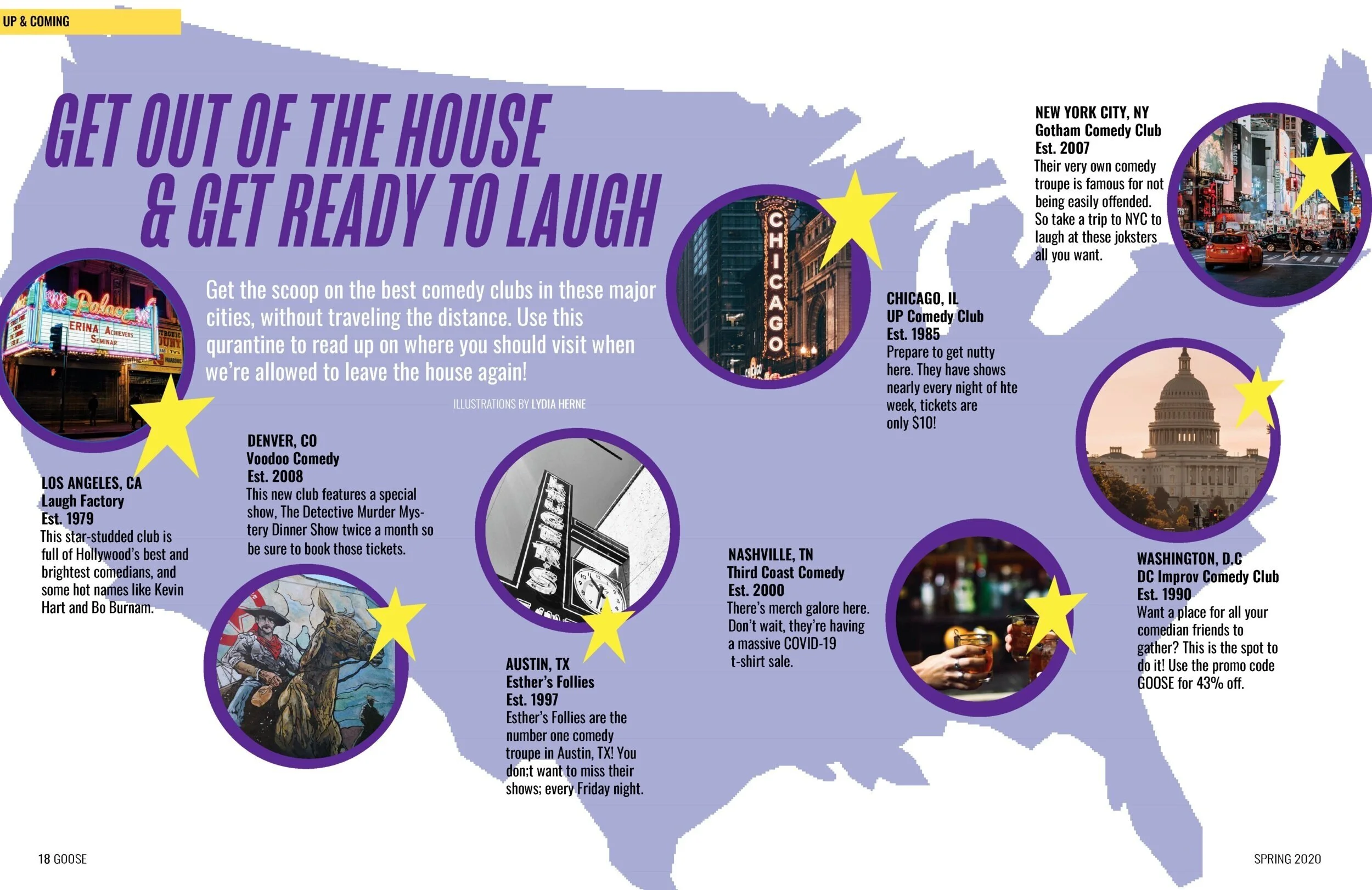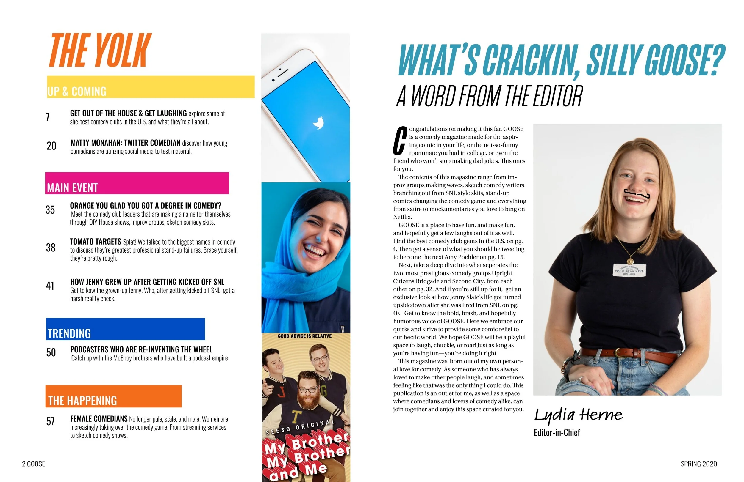 GOOSE is a comedy magazine for everyone from the amateur stand-up comedian to the likes of John Mulaney and Leslie Jones. During the spring of my senior year I took a publication design course, and fell in love with creating beautiful and accessible layouts for magazines. GOOSE was a true labor of love…from crafting every layout from scratch, spending hours picking the right typefaces and color palette, to scouring the web and getting permission to use high quality images. Take a minute or two to flip through the inagural issue of GOOSE below!